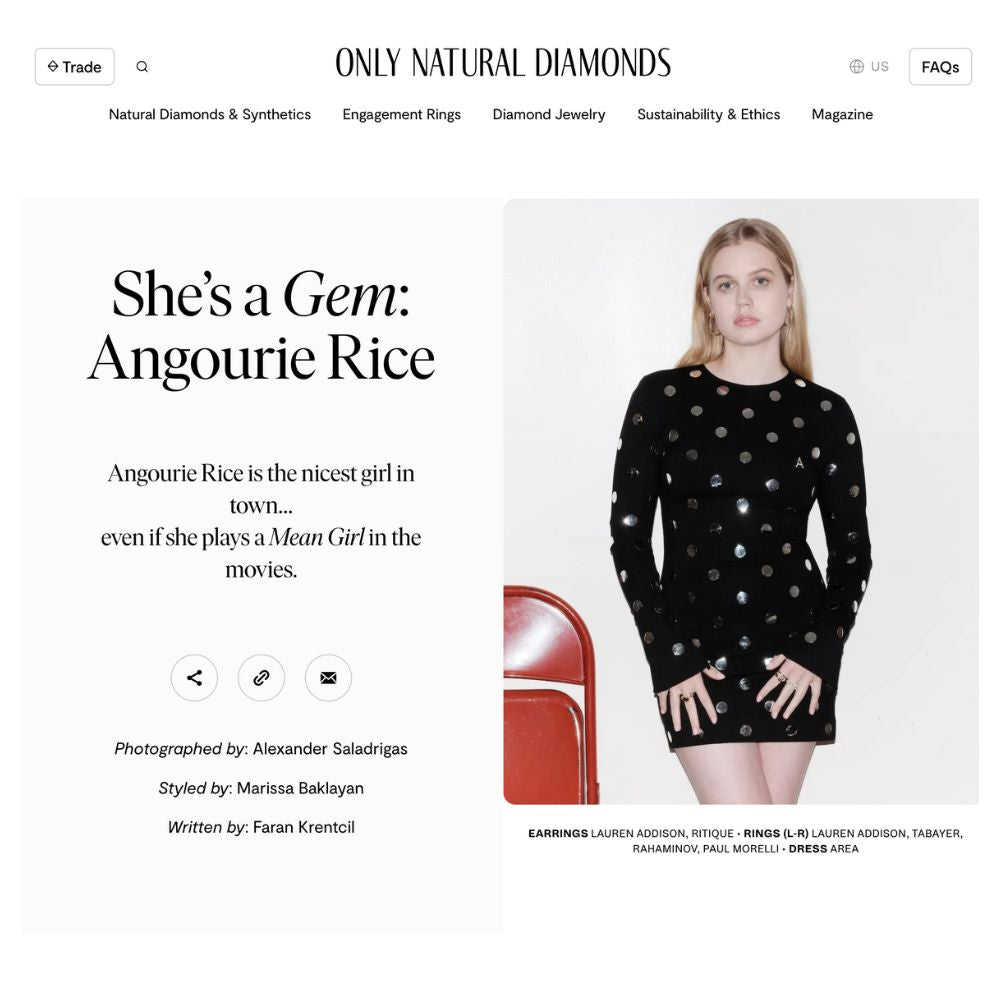 Actress Angourie Rice was spotlighted in Natural Diamonds 2024 as part of a radiant feature titled “Mean Girls Actress Angourie Rice Is a Shining Natural Diamond.” Within the editorial, she was photographed wearing exquisite pieces from Lauren Addison Jewelry, including signature earrings and—most notably—a bespoke ring that stands out in stylistic harmony with her refined yet fresh aesthetic
