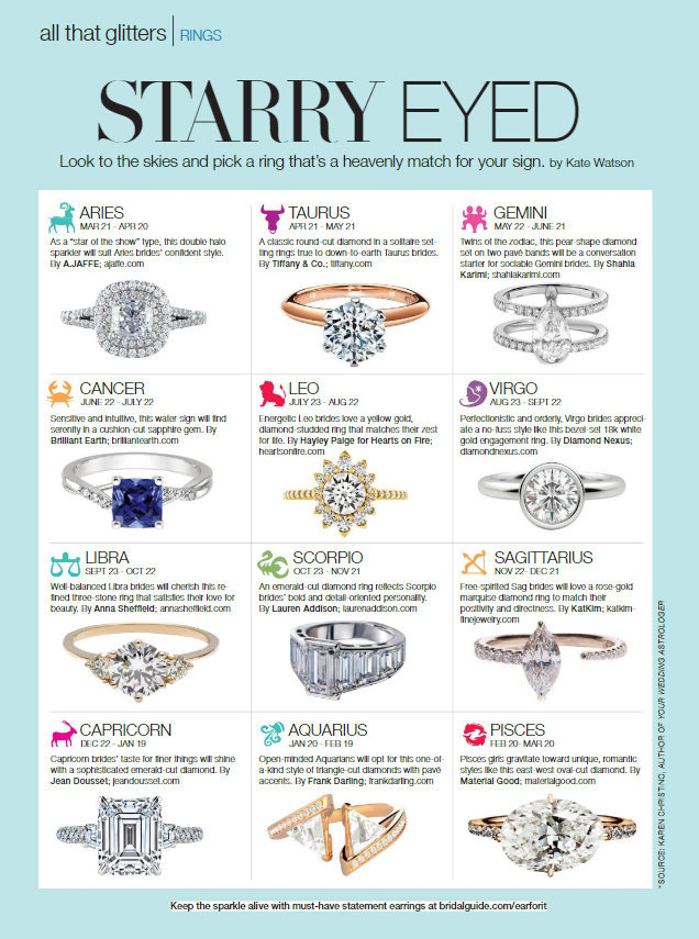 Bridal Guide highlights Lauren Addison's Emerald-cut Diamond Ring as a perfect choice for any Scorpio with their bold and detail-oriented personality in their 2019 feature 'Starry Eyed.'