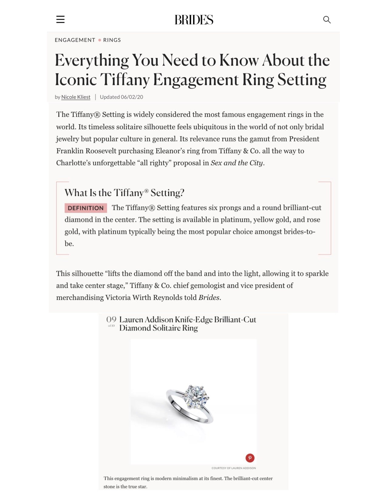 Brides Today features Lauren Addison's Knife-edge Brilliant-cut Diamond Solitaire Ring in their 2020 feature 'Everything You Need to Know About the Iconic Tiffany Engagement Ring Setting.'