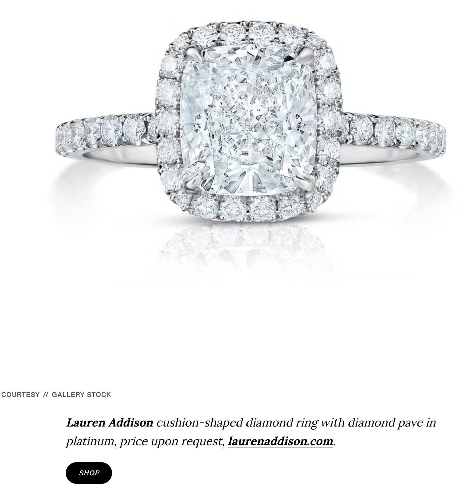 Harper's Bazaar highlights Lauren Addison's Cushion-shaped Diamond Ring in their 2018 feature '35 Cushion-cut Engagement Rings to Swoon Over.' Bazaar explains that the cushion cut has risen in popularity for its timelessness, beauty and durability.