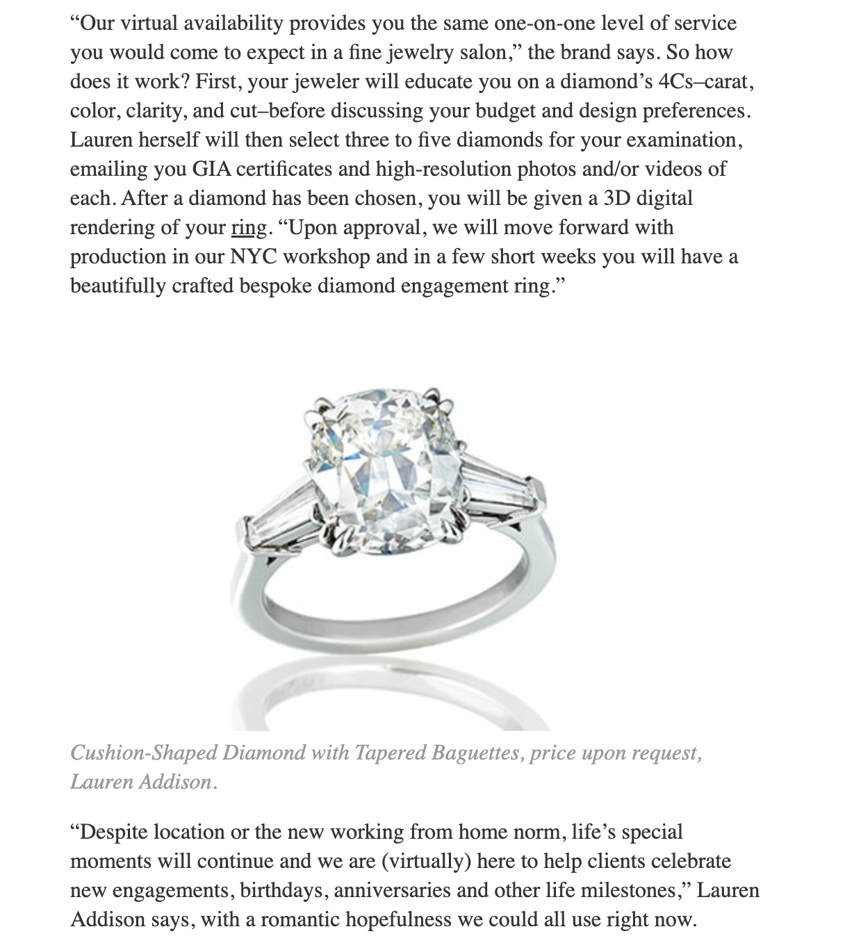 DuJour features Lauren Addison's Cushion-Shaped Diamond with Tapered Baguettes Ring in their feature 'Try Virtual Engagement Ring Shopping.'