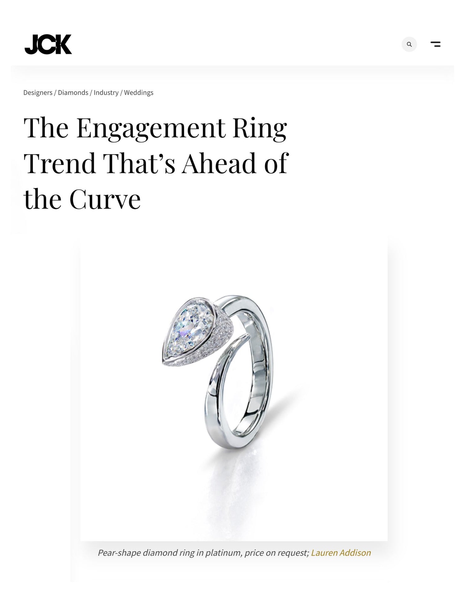 JCK features Lauren Addison's Pear-shaped Diamond Ring in their 2024 feature 'The Engagement Ring Trend That's Ahead of the Curve.'