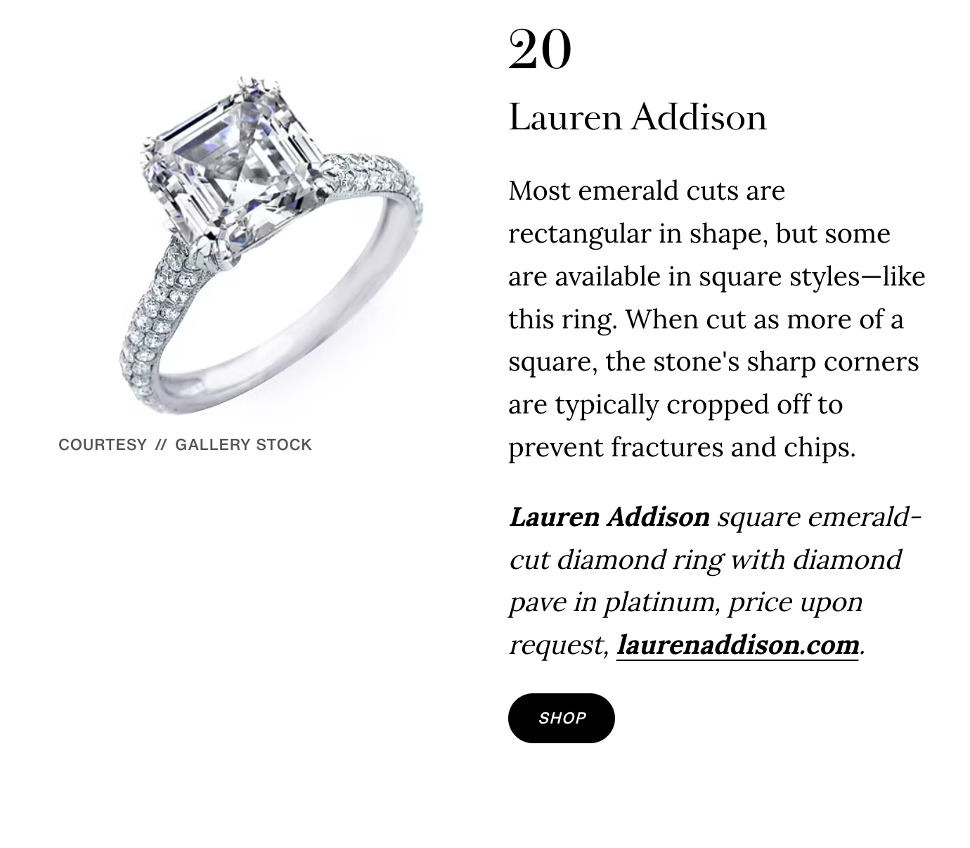 Harper's Bazaar features Lauren Addison's Square Emerald-cut Diamond with Diamond Pave in Platinum in their 2021 feature '33 Emerald Cut Engagement Rings to Fall in Love With.' Bazaar explains emerald-cut engagement rings as show-stopping with a linear shape flatters the finger, making it appear long and lean.