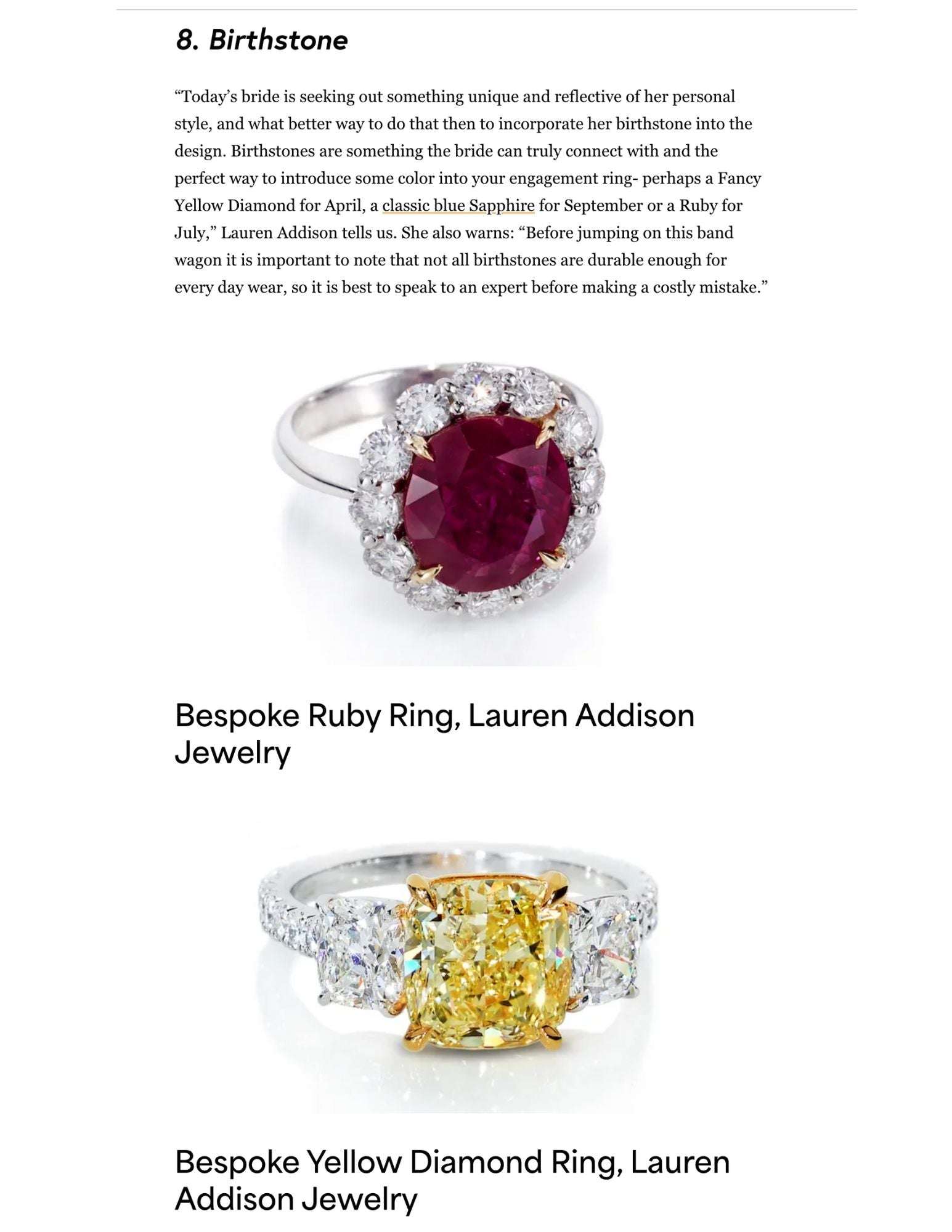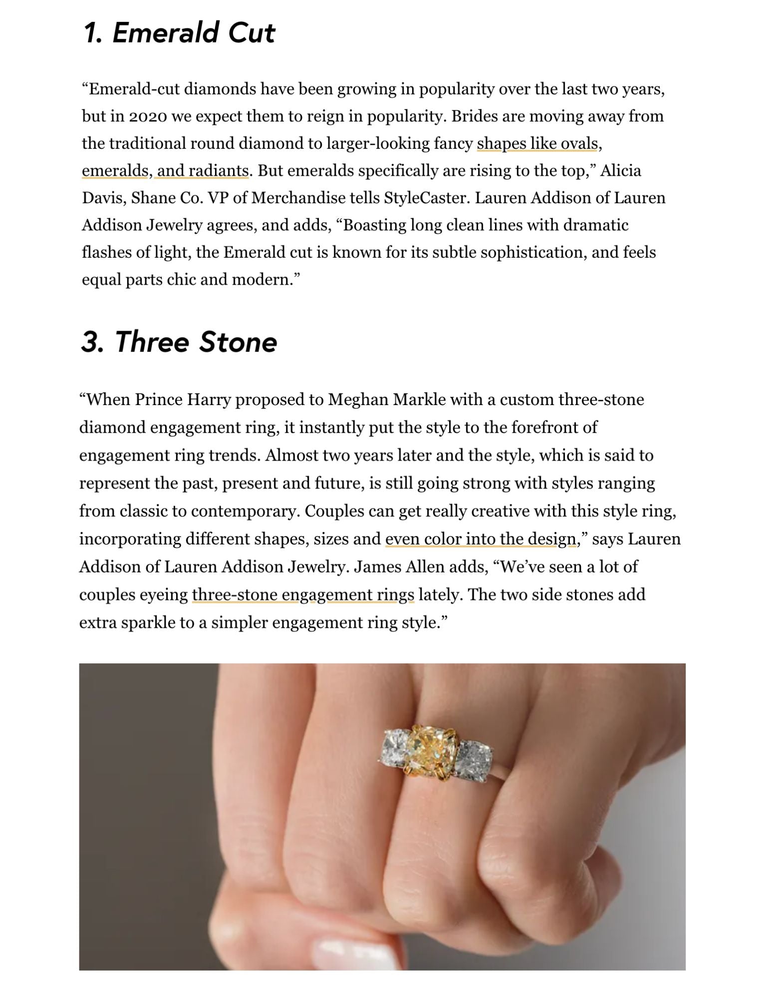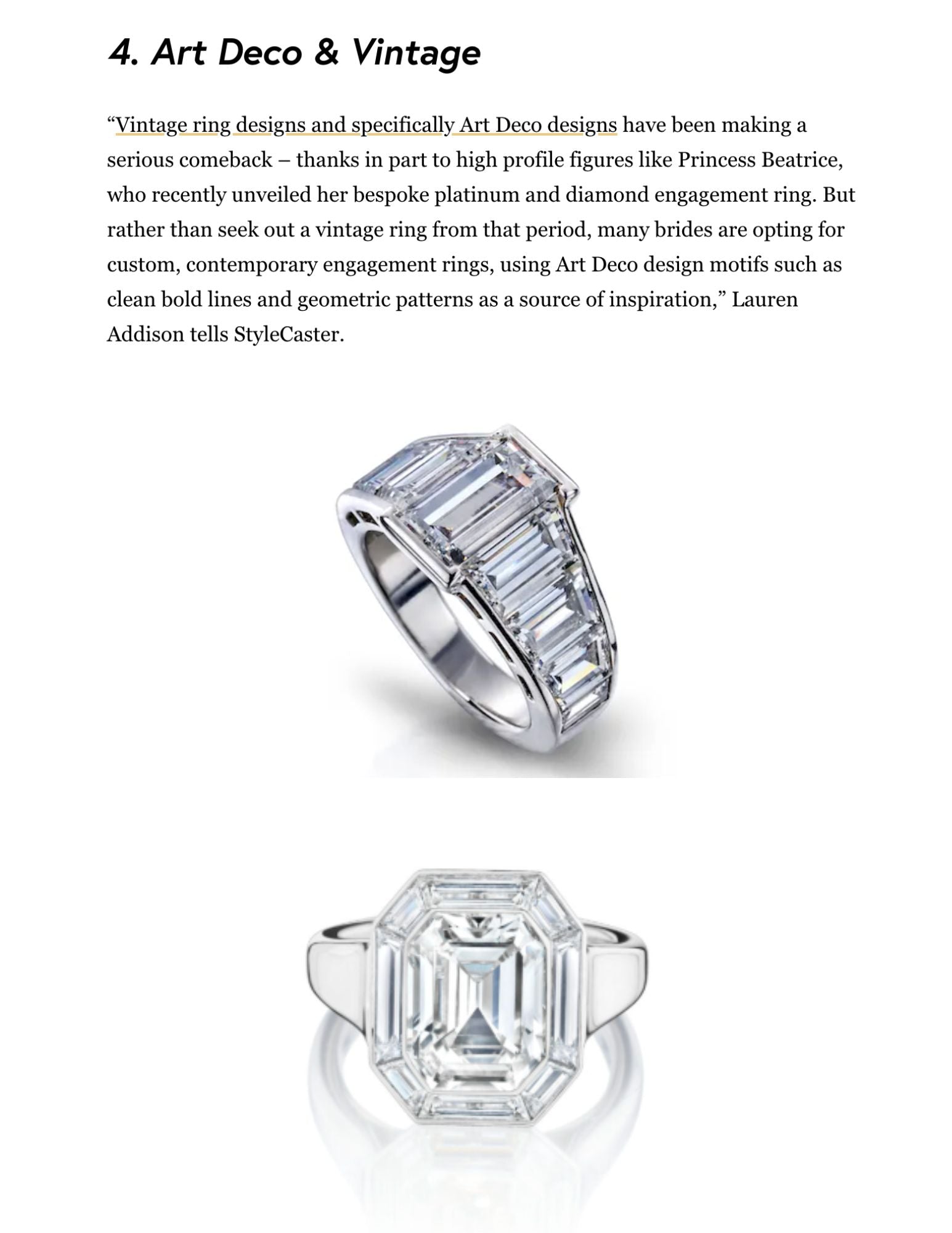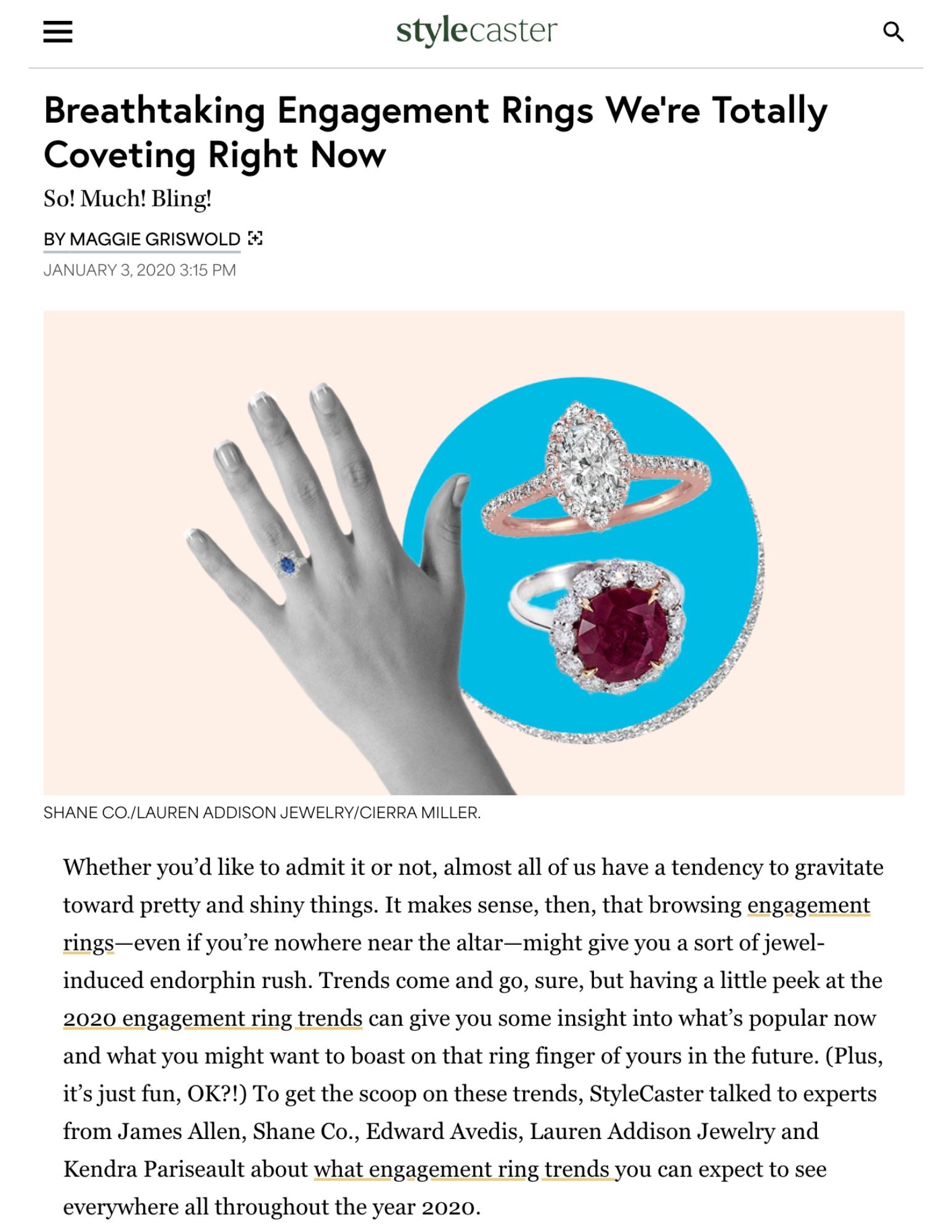 Stylecaster highlights multiple engagement ring styles from Lauren Addison's collection in their 2020 feature 'Breathtaking Engagement Rings We're Totally Coveting Right Now.'
