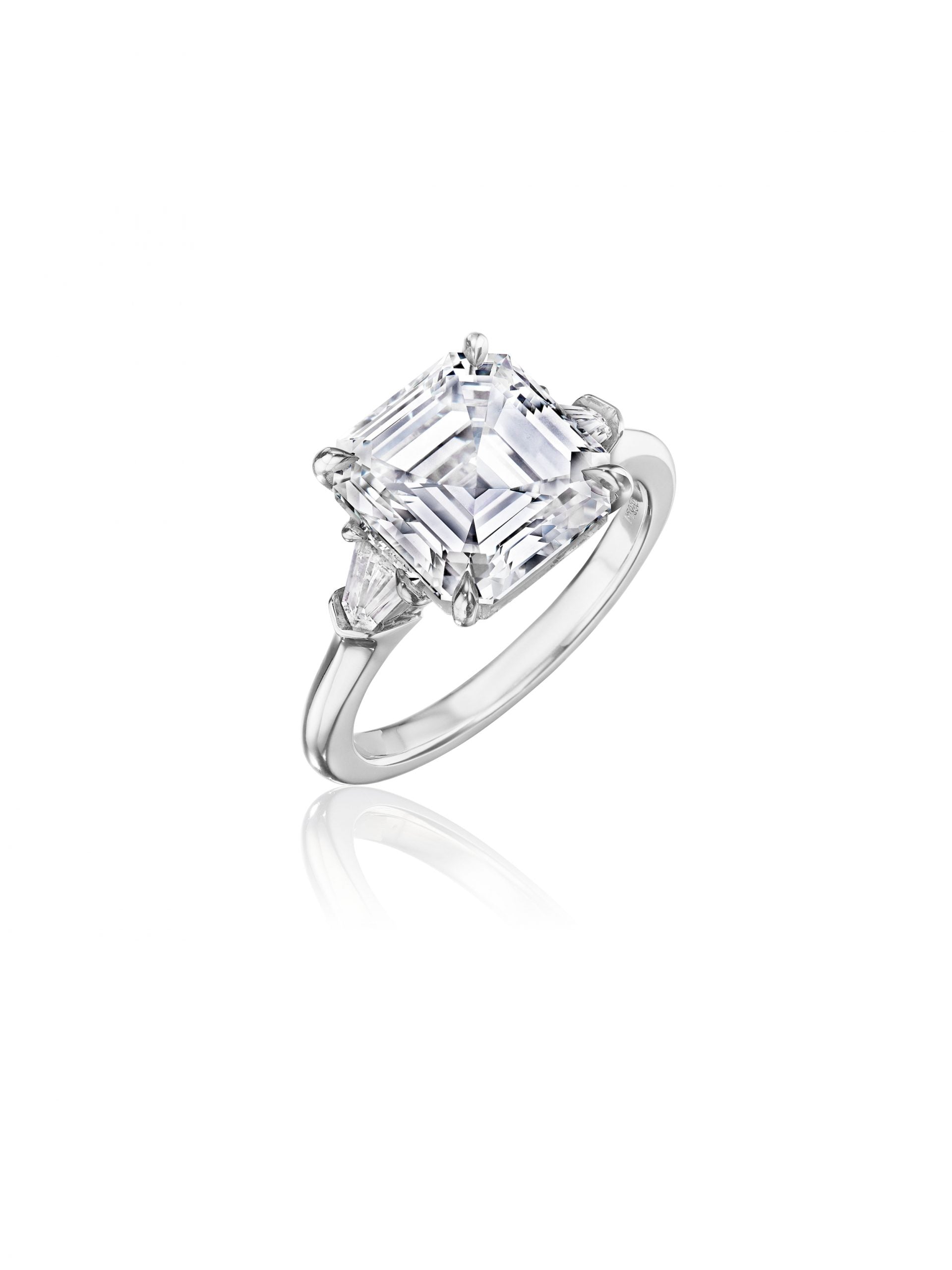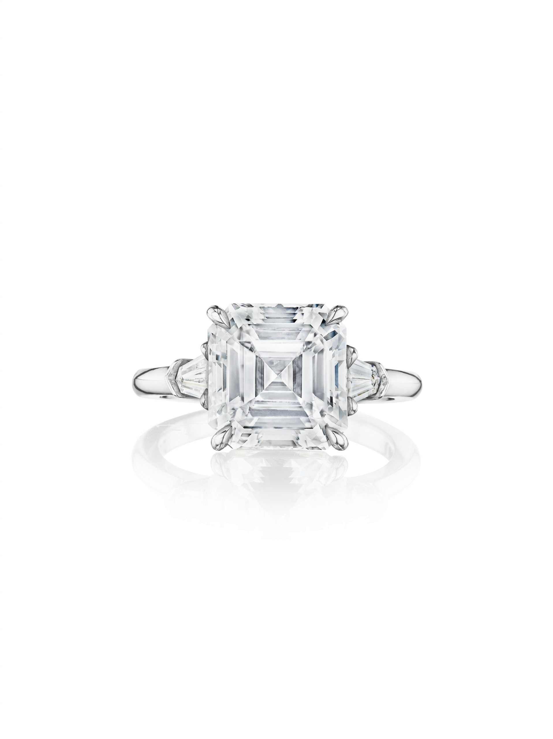 A striking asscher-cut diamond set with sleek bullet-shaped side stones, expertly crafted in platinum.