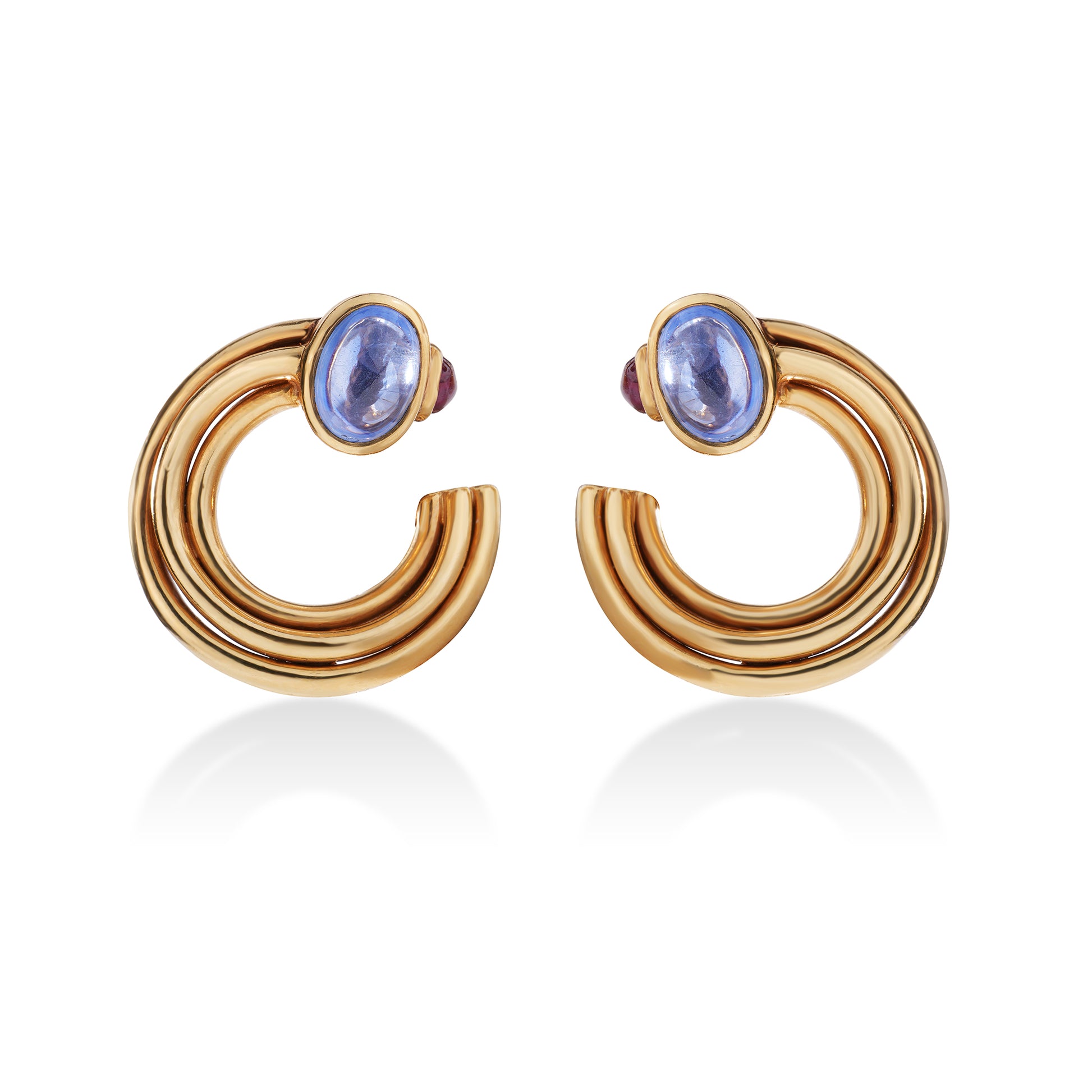 Vintage Bvlgari Oval Cabochon Ceylon Sapphire & Ruby gold hoop ear clips circa 1953.