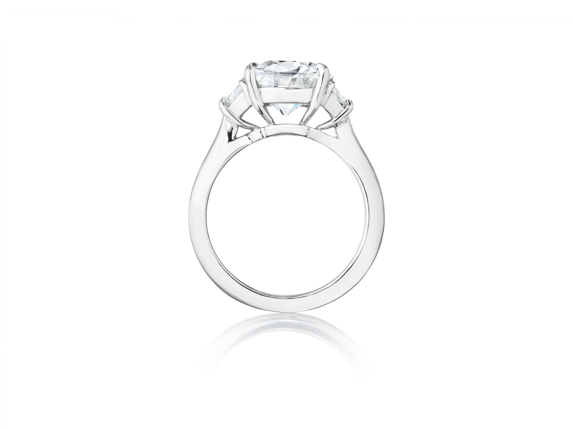 Cushion-brilliant diamond mounted with half moon shaped diamond side stones, handcrafted in platinum.