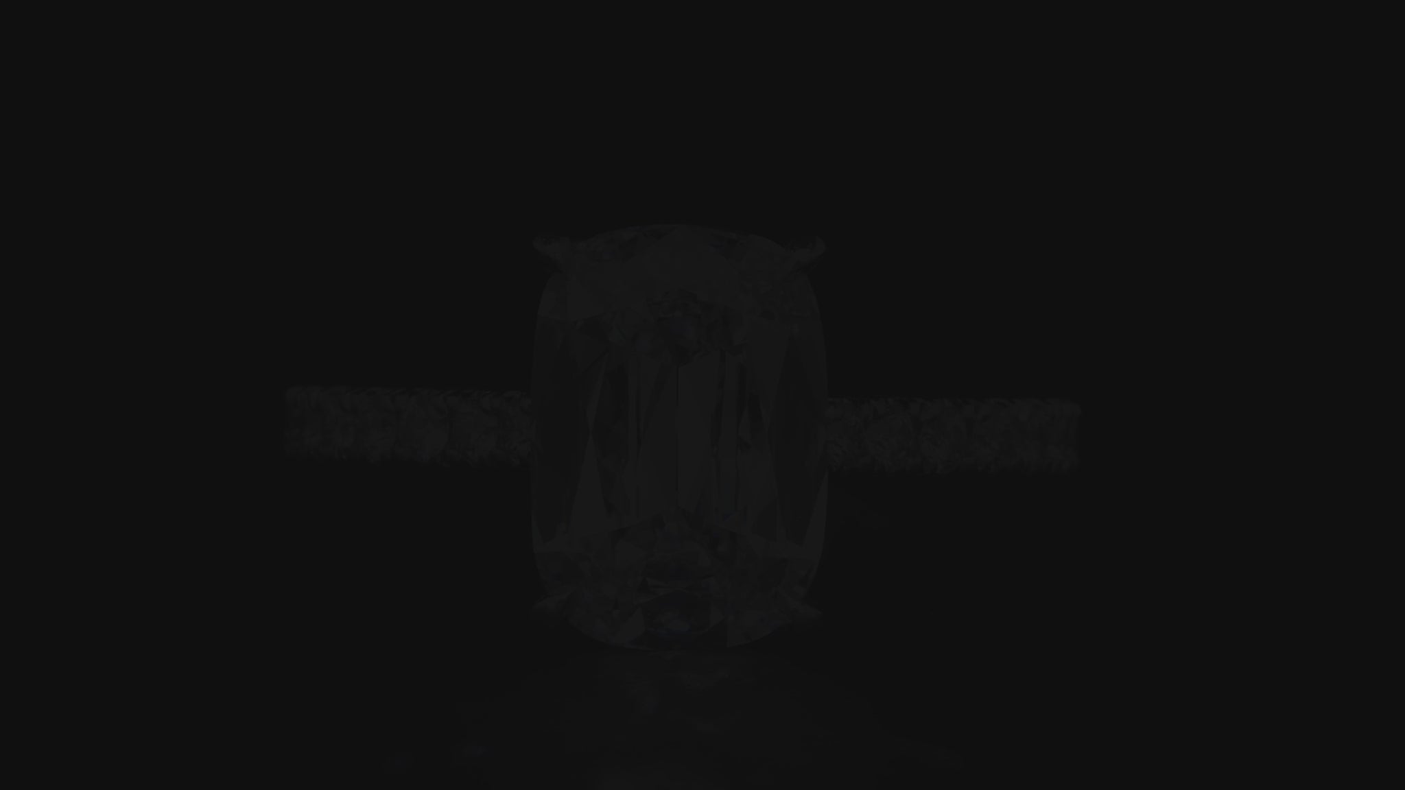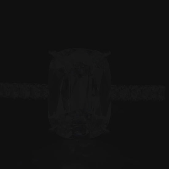 A stunning elongated cushion brilliant-cut diamond adorned by pave diamonds, crafted in platinum.