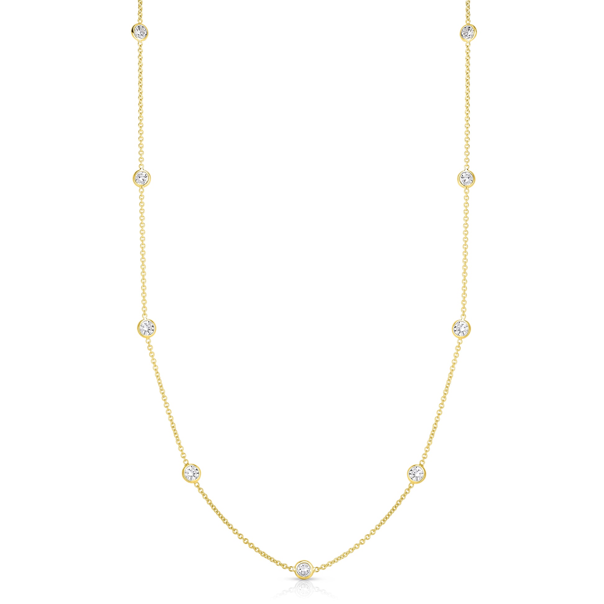 Crafted in 18kt gold, the Diamond by the Yard Necklace elegantly showcases 11 bezel-set round brilliant-cut diamonds totaling 2.75 carats, evenly spaced for effortless sparkle.