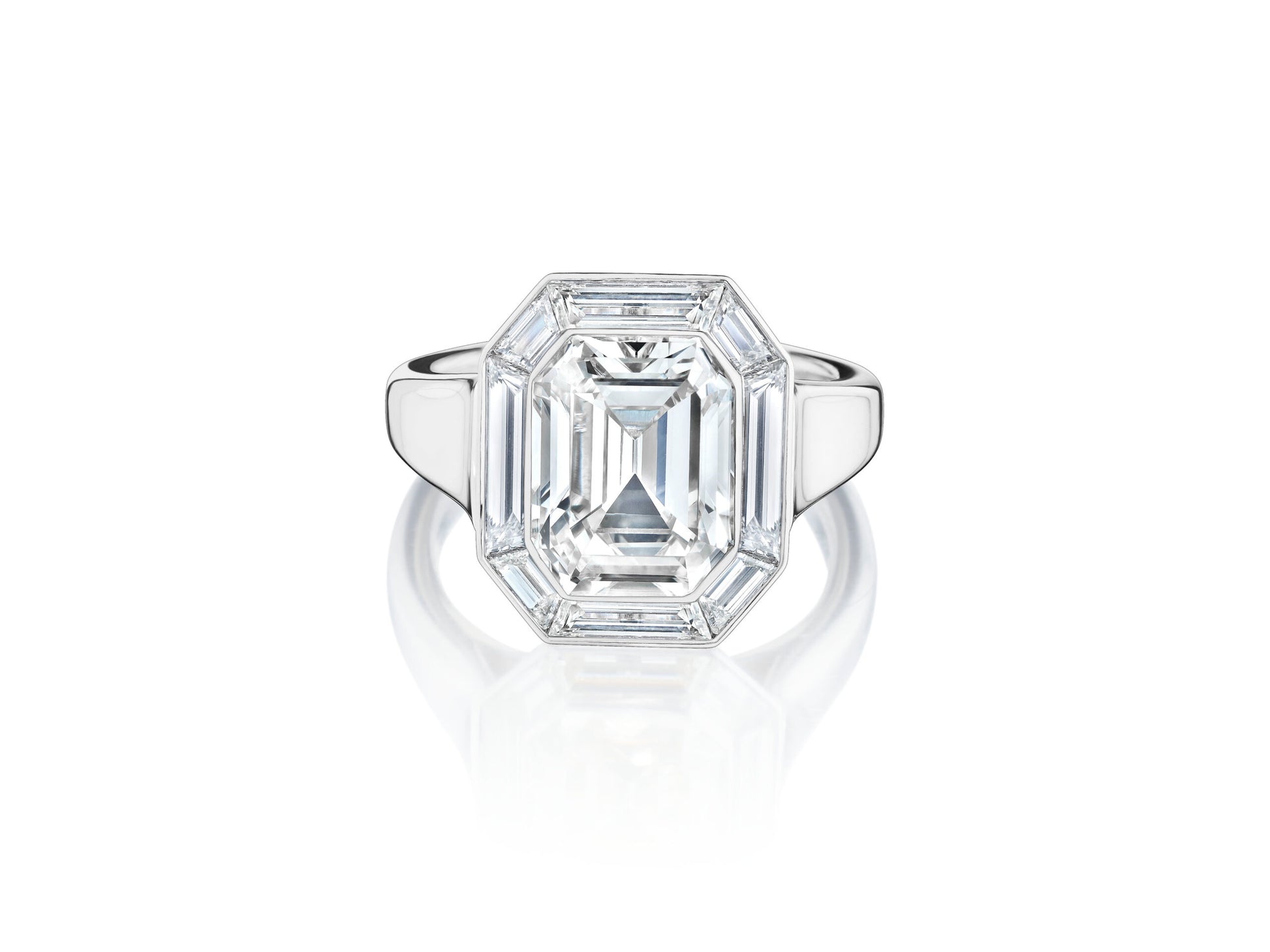 An eye-catching emerald-cut diamond is framed by custom cut baguette diamonds, set together in a unique bezel setting that creates the illusion of a solitaire diamond ring.
