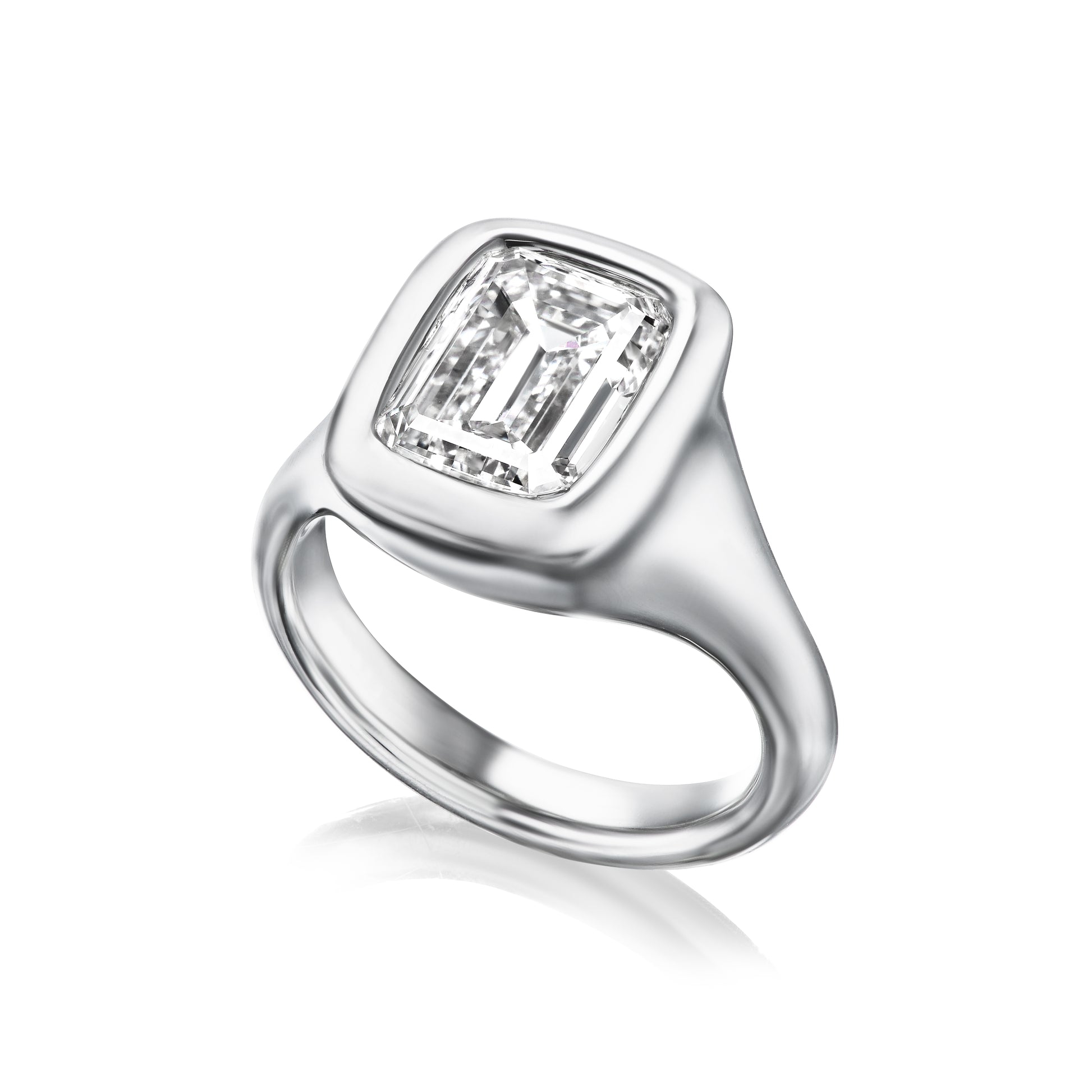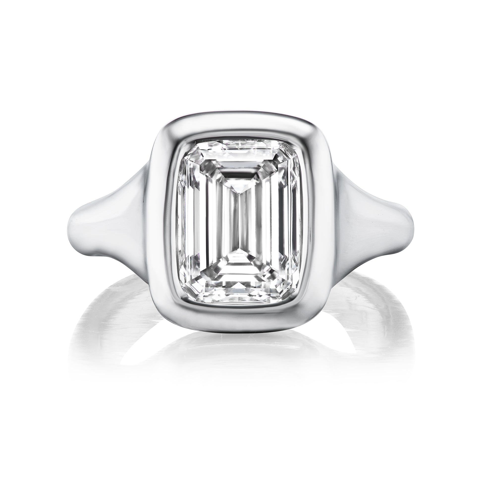 Sleek and modern, the Emerald-Cut Diamond Bezel Ring showcases a step-cut diamond set in a handcrafted platinum bezel with a tapered shank for a bold, yet refined look.