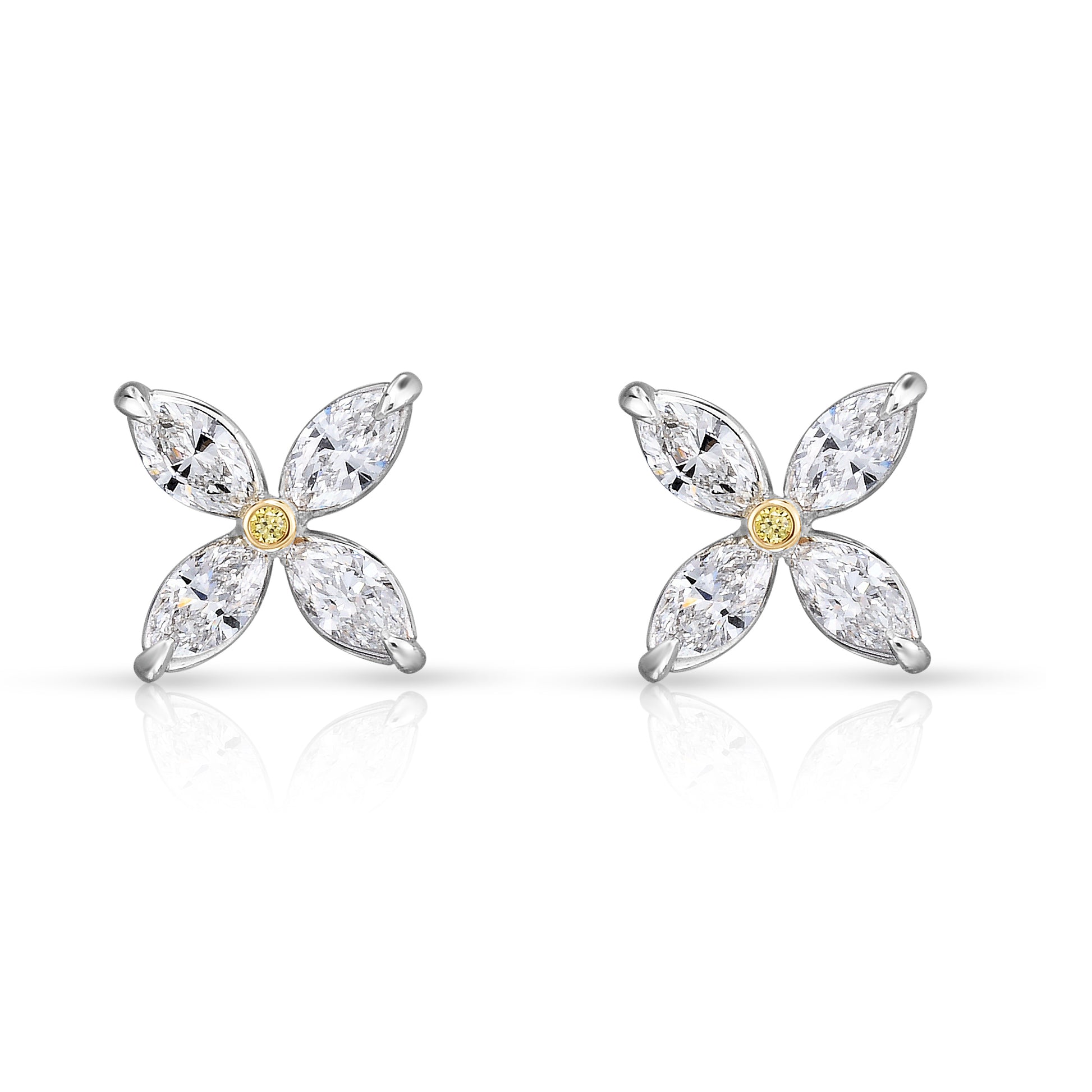 Inspired by nature’s elegance, our marquise-shaped floral diamond earrings showcase a vivid fancy yellow diamond at the center, encircled by four marquise-shaped diamonds, all masterfully handcrafted in platinum and 18kt yellow gold.