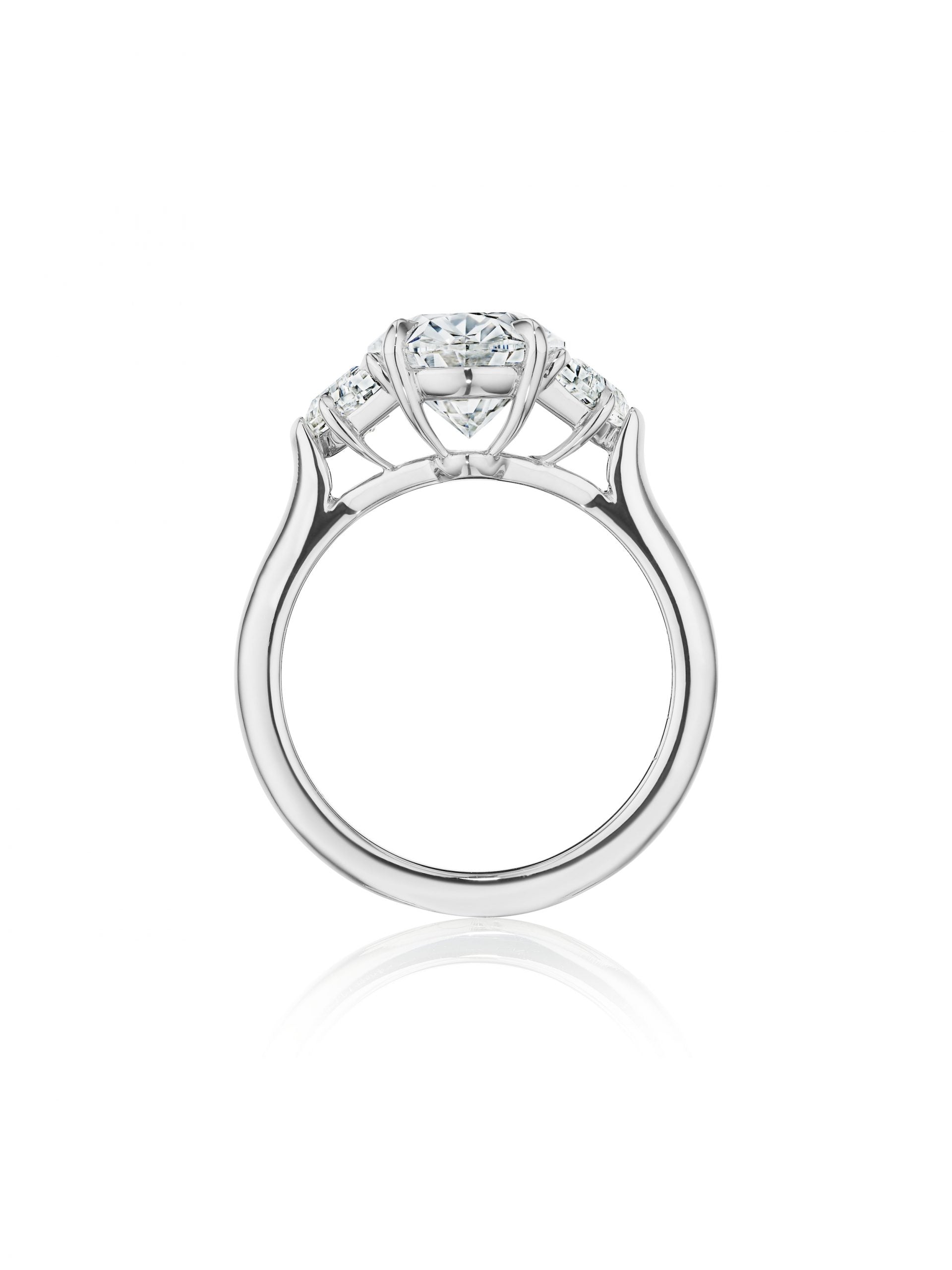 A stunning elongated oval-shaped diamond mounted with epaulette side stones, crafted in platinum.