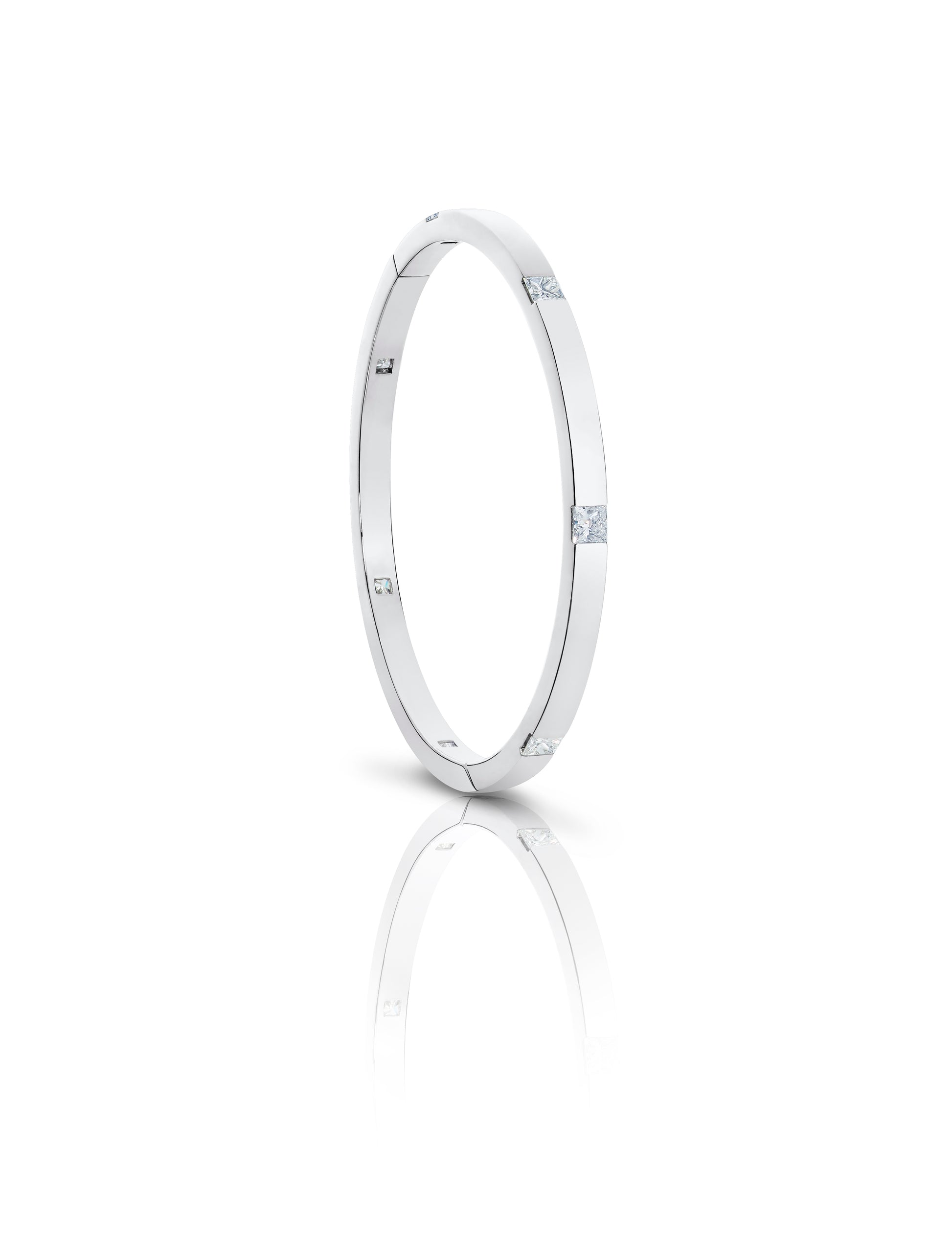 Sophisticated and chic, this bangle features six princess-cut diamonds totaling 1.73 carats, crafted in 18kt white gold. Wear solo or stack along with your favorite pieces.