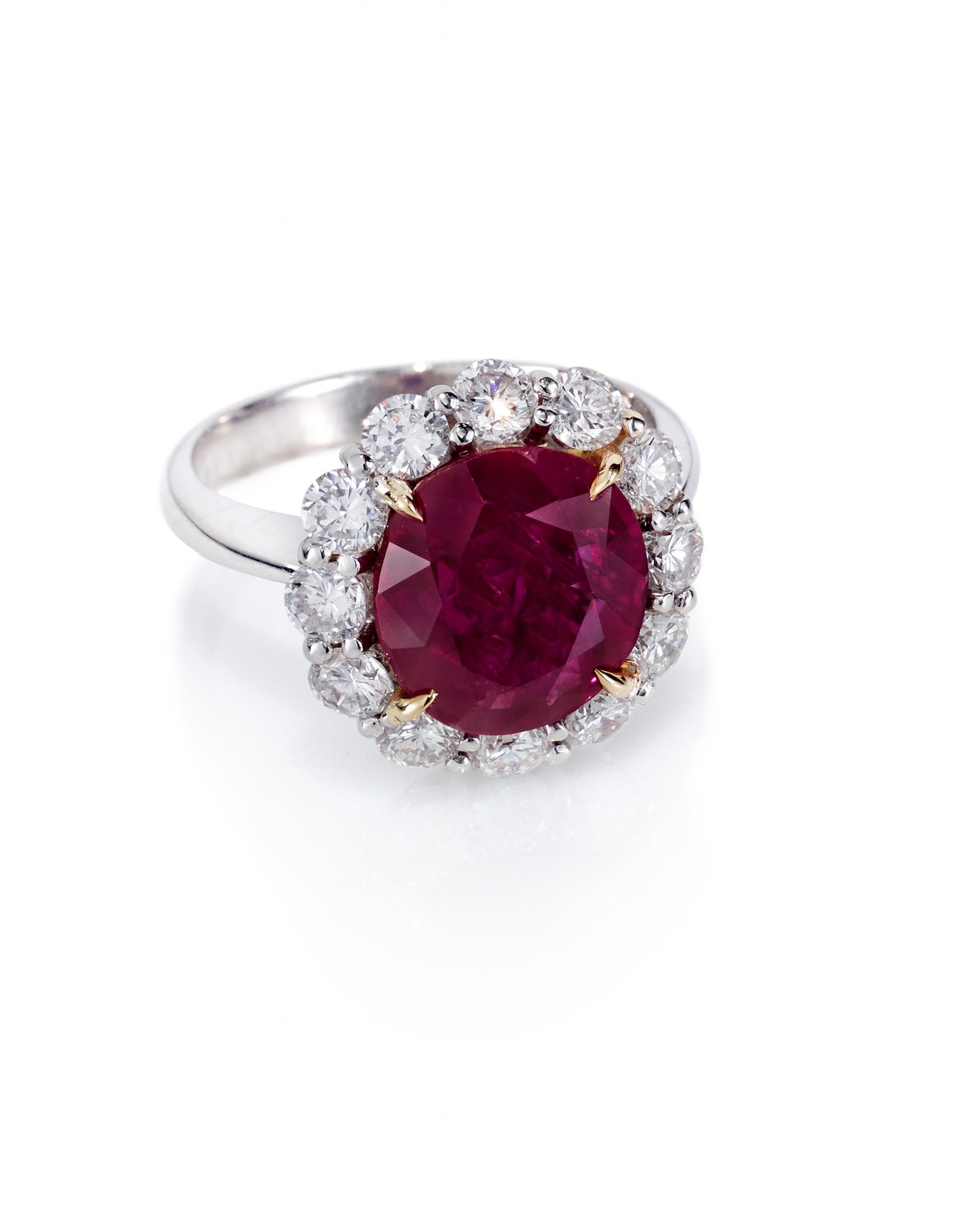 Vibrant and romantic, the Ruby and Diamond Cluster Ring features a rich red center stone surrounded by a floral halo cluster of sparkling diamonds.