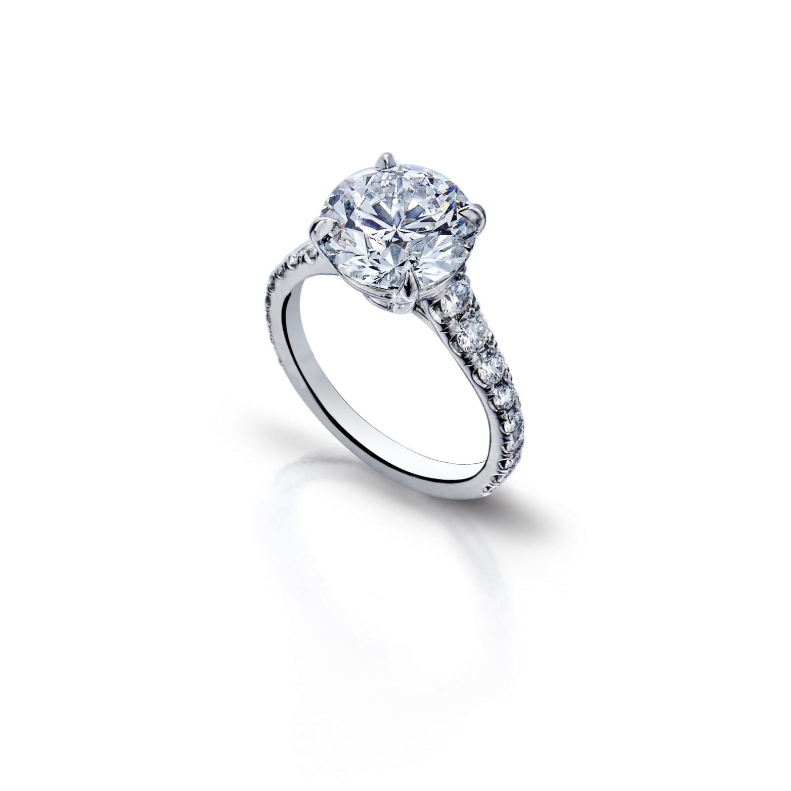 Our signature graduated pave diamond solitaire ring featuring a round brilliant-cut diamond, handcrafted in platinum.
